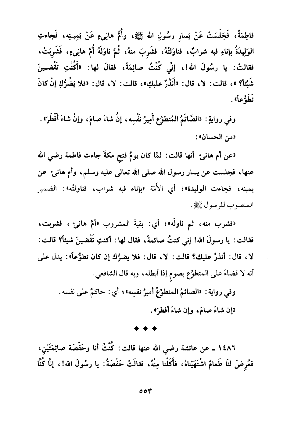 فاطِمَةُ، فَجَلَسَتْ عَنْ يَسارِ رسُولِ الله - صلى الله عليه وسلم -، وأُمُّ هانِئٍ عَنْ يَمِينِه، فَجاءتِ الوَبيدَةُ بإناءٍ فيه شرابٌ، فناوَلتْهُ، فشَرِبَ منهُ، ثُمَّ ناوَلَهُ أُمَّ هانِئٍ، فَشَرِبَتْ، فقالتْ: يا رسُولَ الله!، إنِّي كُنْتُ صَائِمَةً، فقالَ لها: "أَكُنْتِ تَقْضينَ شَيْئًا؟ "، قالت: لا، قال: "أَنَذْرٌ عليكِ؟ "، قالت: لا، قال: "فلا يَضُرُّكِ إنْ كانَ تَطَوُّعًا".