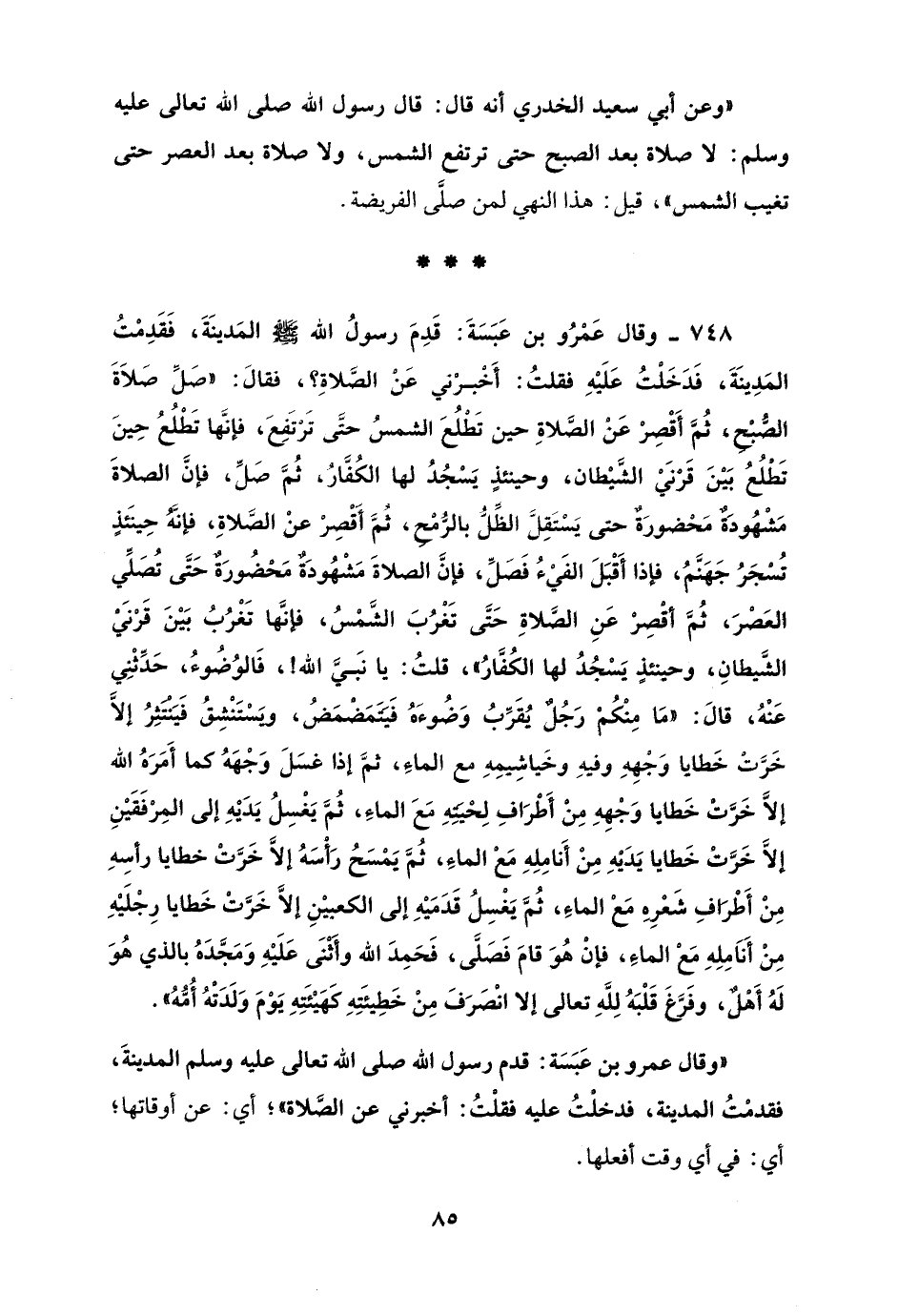 748 - وقال عَمْرُو بن عَبَسَةَ: قَدِمَ رسولُ الله - صلى الله عليه وسلم - المَدينَةَ، فَقَدِمْتُ المَدِيِنَةَ، فَدَخَلْتُ عَلَيْهِ فقلتُ: أَخْبرْني عَنْ الصَّلاةِ؟، فقالَ: "صَلِّ صَلاَةَ الصُّبْحِ، ثُمَّ أَقْصِرْ عَن الصَّلاةِ حين تَطلُعَ الشمسُ حتَّى تَرْتَفِعَ، فإنَّها تَطْلُعُ حِينَ تَطْلُعُ بَيْنَ قَرْنَيْ الشَّيْطان، وحينئذٍ يَسْجُدُ لها الكُفَّارُ، ثُمَّ صَلِّ، فإنَّ الصلاةَ مَشْهُودَةٌ مَحْضورَةٌ حَتَّى يَسْتَقِلَّ الظِّلُّ بالرُّمْحِ، ثُمَّ أَقْصِرْ عنْ الصَّلاةِ، فإنَّهُ حِينَئذٍ تُسْجَرُ جَهَنَّمُ، فإذا أَقْبَلَ الفَيْءُ فَصَلِّ "فإنَّ الصلاةَ مَشْهُودَةٌ مَحْضُورَةٌ حَتَّى نُصَلِّي العَصْرَ، ثُمَّ أقْصِرْ عَنِ الصَّلاةِ حَتَّى تَغْرُبَ الشَّمْسُ، فإنَّها تَغْرُبُ بَيْنَ قَرْنَيْ الشَّيطانِ، وحينئذٍ يَسْجُدُ لها الكُفَّارُ"، قلتُ: يا نَبِيَّ الله!، فَالوُضُوءُ، حَدِّثْنِي عَنْهُ، قالَ: "مَا مِنْكُمْ رَجُلٌ يُقَرِّبُ وَضُوءَهُ فَيَتَمَضْمَضُ، ويَسْتَنْشِقُ فَيَنْتَثِرُ إلاَّ خَرَّتْ خَطايا وَجْهِهِ وفيهِ وخَياشِيمِهِ مع الماءِ، ثمَّ إذا غسَلَ وَجْهَهُ كما أَمَرَهُ الله إلَّا خَرَّتْ خَطايا وَجْهِهِ مِنْ أَطْرَافِ لِحْيَتِهِ مَعَ الماءِ، ثُمَّ يَغْسِلُ يَدَيْهِ إلى المِرْفَقَيْنِ إلاَّ خَرَّتْ خَطايا يَدَيْهِ مِنْ أَنامِلِهِ مَعْ الماءِ، ثُمَّ يَمْسَحُ رَأْسَهُ إلاَّ خَرَّتْ خطايا رأسِهِ مِنْ أَطْرَافِ شَعْرِهِ مَعْ الماءِ، ثُمَّ يَغْسِلُ قَدَمَيْهِ إلى الكعبيْنِ إلاَّ خرَّتْ خَطايا رِجلَيْهِ مِنْ أَنَامِلِهِ مَعْ الماءِ، فإن هُوَ قامَ فَصَلَّى، فَحَمِدَ الله وأَثْنَى عَلَيْهِ وَمَجَّدَهُ بالذي هُوَ لَهُ أَهْلٌ، وفَرَّغَ قَلْبَهُ للهِ تعالى إلا انْصَرَفَ مِنْ خَطِيئَتِهِ كَهَيْئَتِهِ يَوْمَ وَلَدَتْهُ أُمُّهُ".