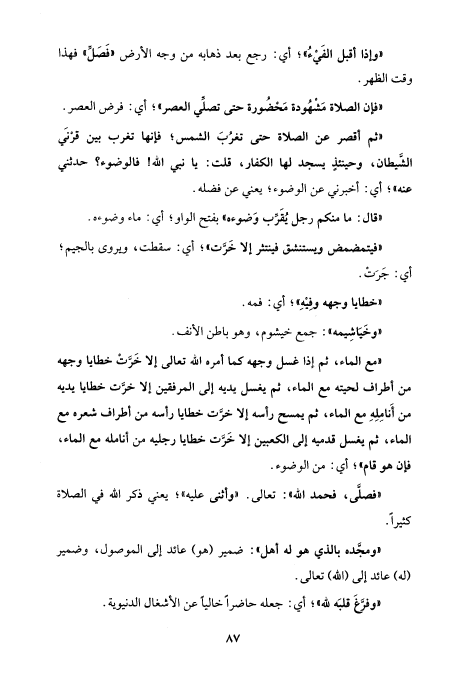 "ثم أقصر عن الصلاة حتى تغرُبَ الشمس؛ فإنها تغرب بين قرْنَي الشَّيطان، وحينئذٍ يسجد لها الكفار، قلت: يا نبي الله! فالوضوء؟ حدثني عنه"؛ أي: أخبرني عن الوضوء؛ يعني عن فضله.