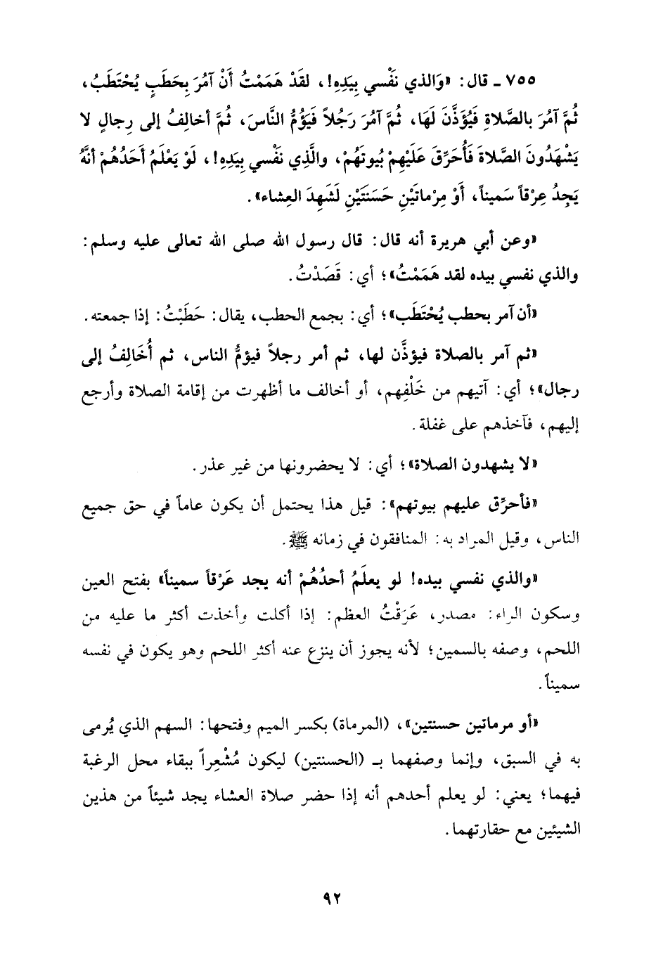 755 - قال: "وَالذي نَفْسي بِيَدِهِ!، لقَدْ هَمَمْتُ أَنْ آمُرَ بِحَطَبٍ يُحْتَطَبُ، ثُمَّ آمُرَ بالصَّلاةِ فَيُؤَذَّنَ لَهَا، ثُمَّ آمُرَ رَجُلاً فَيؤمُّ النَّاسَ، ثُمَّ أخالِفُ إلى رِجالٍ لا يَشْهَدُونَ الصَّلاةَ فَأُحَرِّقَ عَلَيْهِمْ بُيوتَهُمْ، والَّذِي نَفْسي بِيَدِهِ!، لَوْ يَعْلَمُ أَحَدُهُمْ أنَّهُ يَجدُ عِرْقاً سَميناً، أَوْ مِرْماتَيْنِ حَسَنتَيْنِ لَشَهِدَ العِشاء".