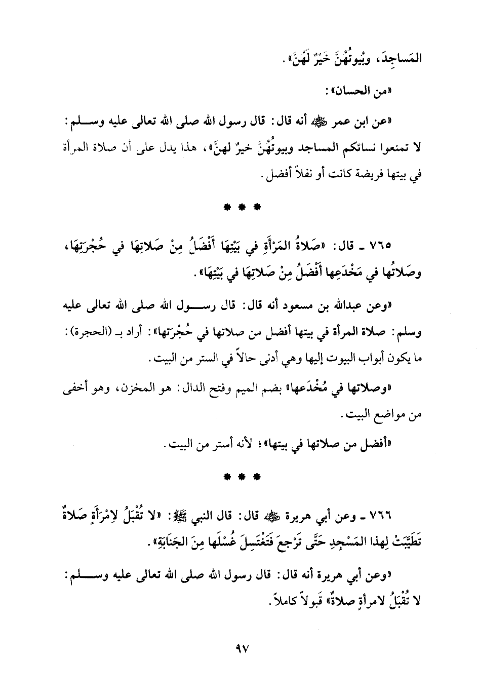 765 - قال: "صَلاةُ المَرْأَةِ في بَيْتِهَا أَفْضَلُ مِنْ صَلاتِهَا في حُجْرَتِهَا، وصَلاتُها في مَخْدَعِها أَفْضَلُ مِنْ صَلاتِهَا في بَيْتِهَا".