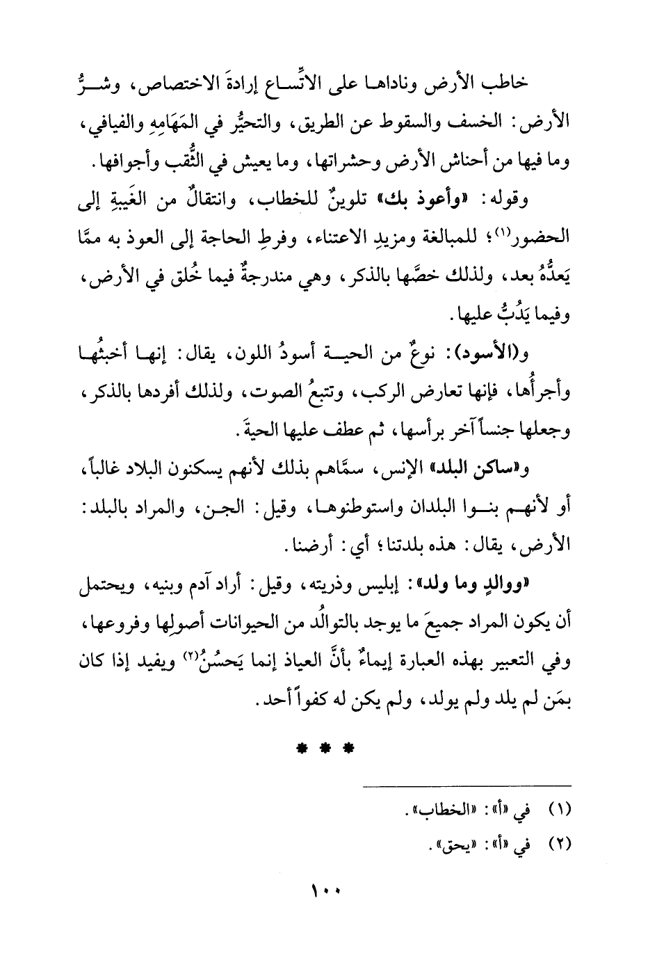 خاطب الأرض وناداها على الاتساع إرادة الاختصاص, وشر الأرض: الخسف والسقوط عن الطريق, والتحير في المهامه والفيافي, وما فيها من أحناش الأرض وحشراتها, وما يعيش في الثقب وأجوافها.