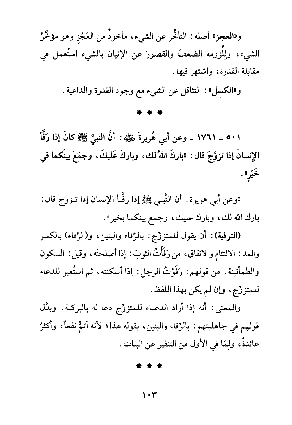 501 - 1761 - وعن أبي هريرة رضي الله عنه: أن النبي صلى الله عليه وسلم كان إذا رفأ الإنسان إذا تزوج قال: " بارك الله لك, وبارك عليك, وجمع بينكما في خير ".