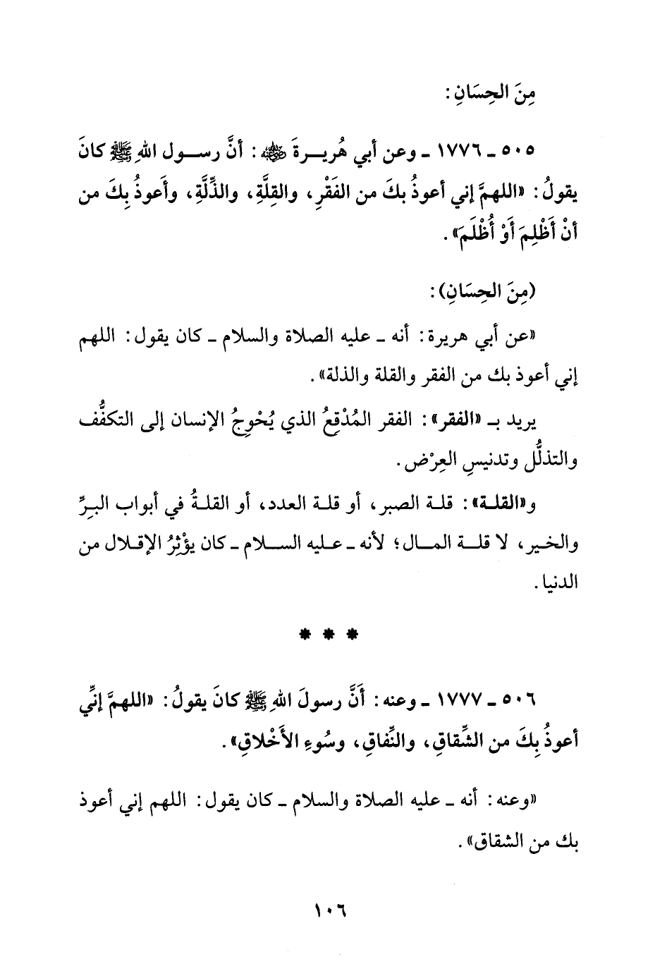 505 - 1776 - وعن أبي هريرة رضي الله عنه: أن رسول الله صلى الله عليه وسلم كان يقول: " اللهم إني أعوذ بك من الفقر, والقلة, والذلة, وأعوذ بك من أن أظلم أو أظلم ".