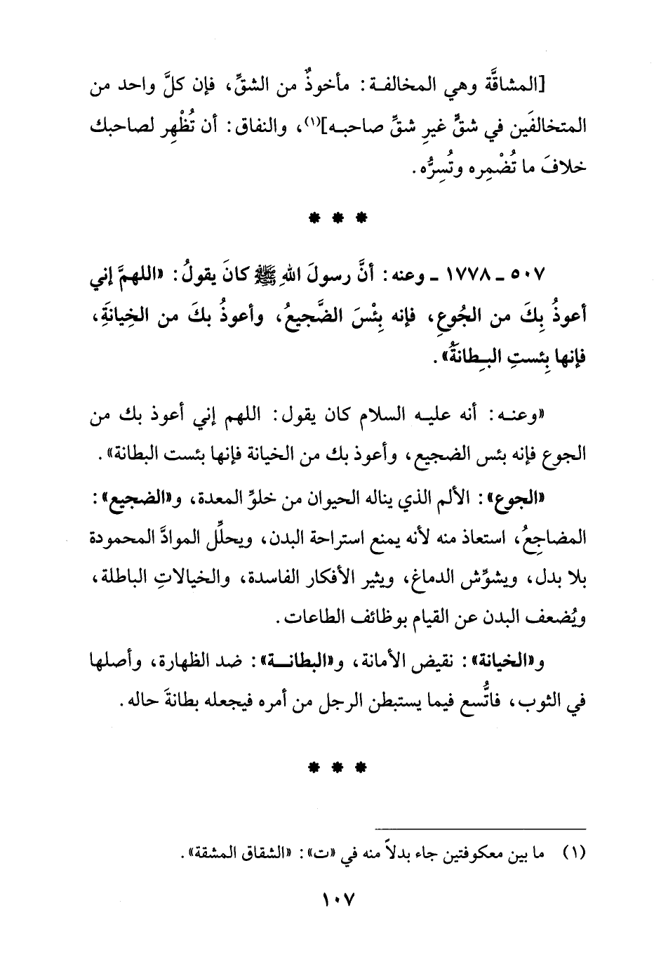 " الجوع ": الألم الذي يناله الحيوان من خلو المعدة, و" الضجيع ": المضاجع, استعاذ منه لأنه يمنع استراحة البدن, ويحلل المواد المحمودة بلا بدل, ويشوش الدماغ, ويثير الأفكار الفاسدة, والخيالات الباطلة, ويضعف البدن عن القيام بوظائف الطاعات.