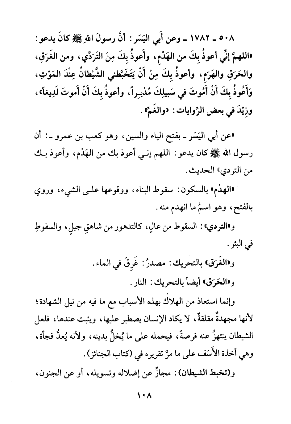 508 - 1782 - وعن أبي اليسر: أن رسول الله صلى الله عليه وسلم كان يدعو: " اللهم إني أعوذ بك من الهدم, وأعوذ بك من التردي, ومن الغرق, والحرق والهرم, وأعوذ بك من أن يتخبطني الشيطان عند الموت, وأعوذ بك أن أموت في سبيلك مدبرا, وأعوذ بك أن أموت لديغا " وزيد في بعض الروايات: " والغم ".