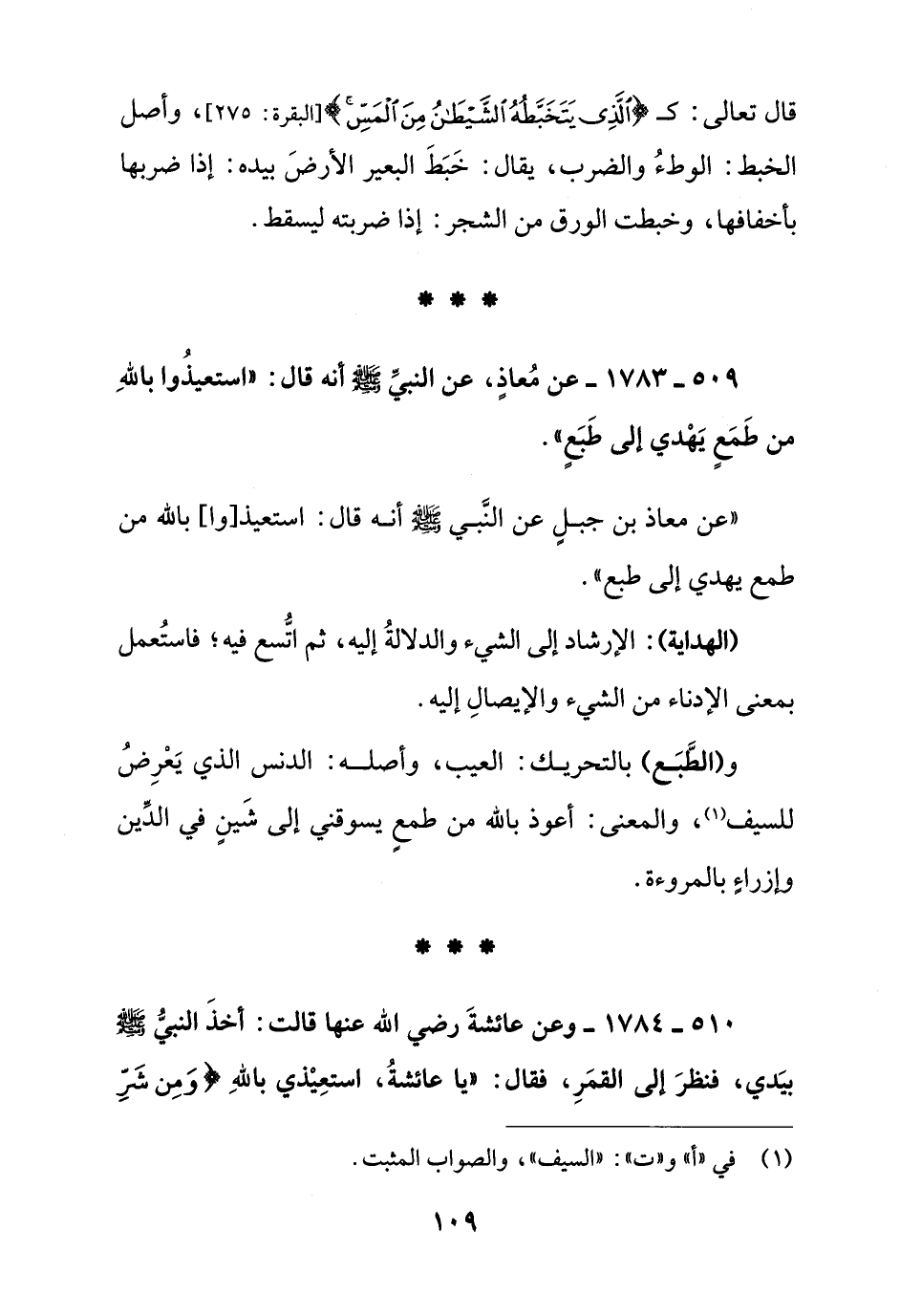 510 - 1784 - وعن عائشة رضي الله عنها قالت: أخذ النبي صلى الله عليه وسلم بيدي, فنظر إلى القمر, فقال: " يا عائشة, استعيذي بالله {ومن شر