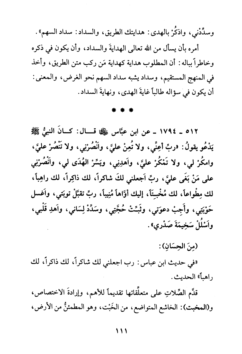 512 – 1794 – عن ابن عباس رضي الله عنهما قال: كان النبي صلى الله عليه وسلم يدعو يقول: " رب أعني, ولا تعن علي, وانصرني, ولا تنصر علي, وامكر لي, ولا تمكر علي, واهدني, ويسر الهدى لي, وانصرني على من بغلى علي, رب اجعلني لك شاكرا, لك ذاكرا, لك راهبا, لك مطواعا, لك مخبتا, غليك أواها منيبا, رب تقبل توبتي, واغسل حوبتي, وأجب دعوتي, وثبت حجتي, وسدد لساني, واهد قلبي, واسلل سخيمة صدري ".