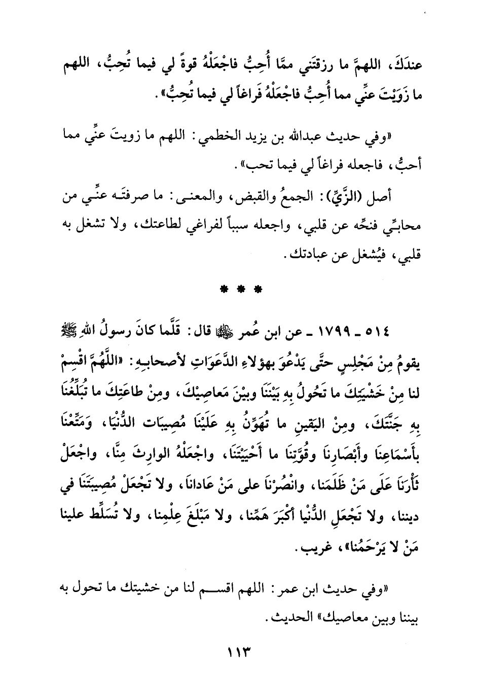 514 – 1799 – عن ابن عمر رضي الله عنهما قال: قلما كان رسول الله صلى الله عليه وسلم يقوم من مجلس حتى يدعو بهؤلاء الدعوات لأصحابه: " اللهم اسم لنا من خشيتك ما تحول بيننا وبين معاصيك, ومن طاعتك ما تبلغنا به جنتك, ومن اليقين ما تهون به علينا مصيبات الدنيا, ومتعنا بأسماعنا وأبصارنا, وقوتنا ما أحييتنا, واجعله الوارث منا, واجعل ثأرنا علة من ظلمنا, وانصرنا على من عادانا, ولا تجعل مصيبتنا في ديننا, ولا تجعل الدنيا أكبر همنا, ولا مبلغ علمنا, ولا تسلط علينا من لا يرحمنا "غريب.