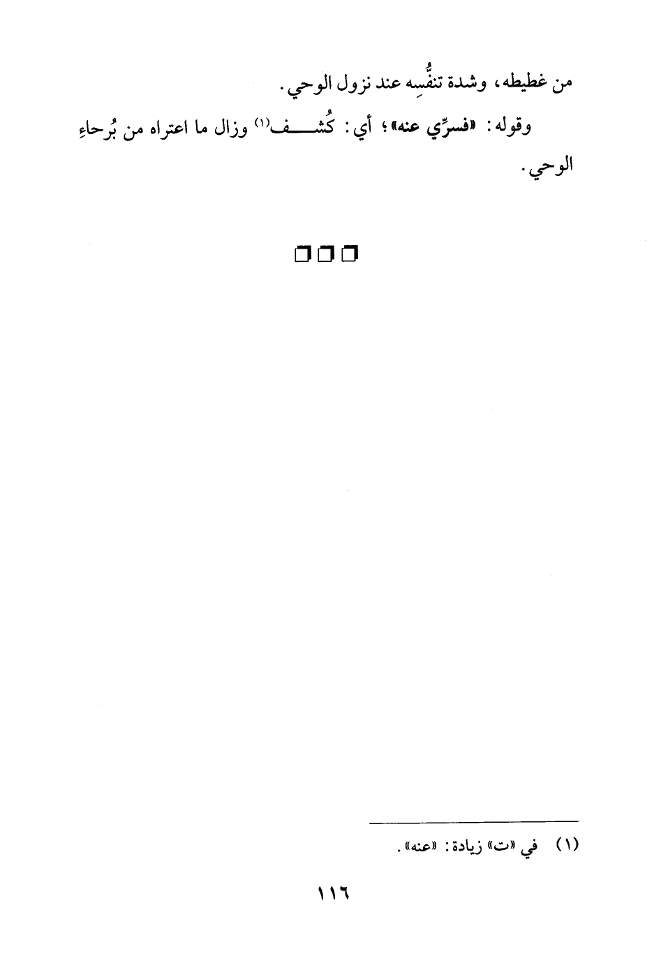 وقوله:" فسري عنه " أي: كشف وزال ما اعتراه من برحاء الوحي.