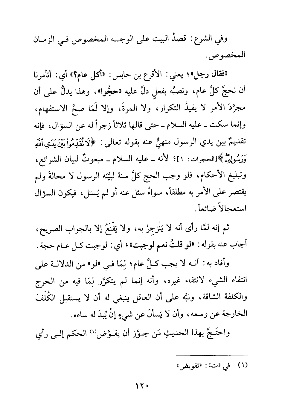 " فقال رجل " يعني: الأقرع بن حابس: " أكل عام " أي: أتأمرنا أن نحج كل عام, ونصبه بفعل دل عليه " حجوا", وهذا يدل على أن مجرد الأمر لا يفيد التكرار, ولا المرة, وإلا لما صح الاستفهام, وإنما سكت - عليه السلام - حتى قالها ثلاثا زجرا له عن السؤال, فإنه تقديم بين يدي الرسول منهي عنه بقوله تعالى: {لا تقدموا بين يدي الله ورسوله} [الحجرات:1] , لأنه - عليه السلام - مبعوث لبيان الشرائع, وتبليغ الأحكام, فلو وجب الحج كل سنة لبينه الرسول لا محالة ولم يقتصر على الأمر به مطلقا, سواء سئل عنه أو لم يسئل, فيكون السؤال استعجالا ضائعا.