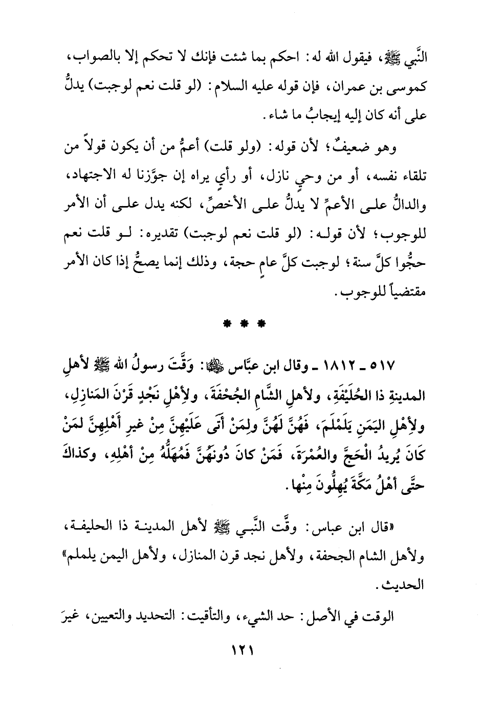 517 - 1812 - وقال ابن عباس رضي الله عنه: وقت رسول الله لأهل المدينة ذا الحليفة, ولأهل الشام الجحفة, ولأهل العراق قرن المنازل, ولأهل اليمن يلملم, فهن لهن ولمن أتى عليهن من غير أهلهن لمن كان يريد الحج والعمرة, فمن كان دونهن فمهله من أهله, وكذاك حتى أهل مكة يهلون منها.