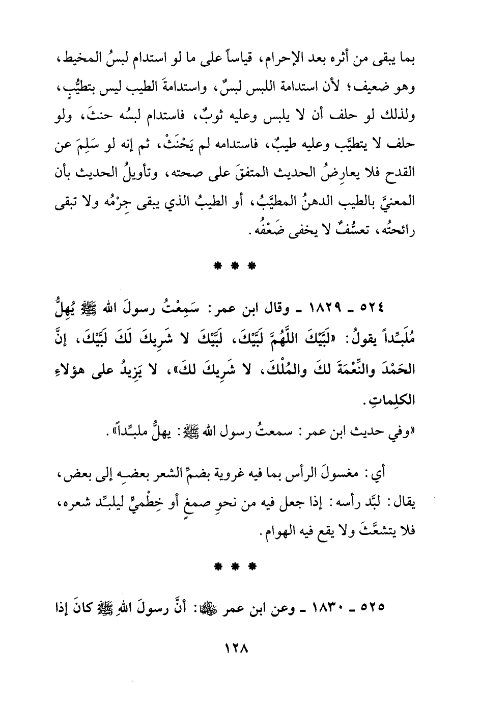 524 - 1829 - وقال ابن عمر: سمعت رسول الله صلى الله عليه وسلم يهل ملبدا يقول: " لبيك اللهم لبيك, لا شريك لك لبيك, إن الحمد والنعمة لك والملك, لا شريك لك " لا يزيد على هؤلاء الكلمات.