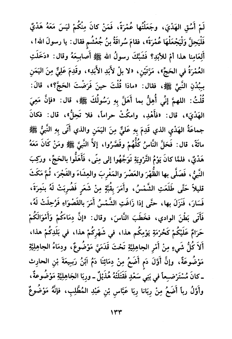 لم أسق الهدي, وجعلتها عمرة, فمن كان منكم ليس معه هدي فليحل وليجعلها عمرة " فقام سراقة بن جعشم فقال: يا رسول الله! ألعامنا هذا أم للأبد؟ فشبك رسول الله صلى الله عليه وسلم أصابعه وقال: دخلت العمرة في الحج, مرتين, " لا بل لأبد الأبد " وقدم علي من اليمن ببدن النبي صلى الله عليه وسلم, فقال: " ماذا قلت حين فرضت الحج " قال: قلت: اللهم إني أهل بما أهل به رسولك صلى الله عليه وسلم, قال: " فإن معي الهدي " قال: " فأهد, وامكث حراما, فلا تحل " وقال: فكان جماعة الهدي الذي قدم به علي من اليمن والذي أتى به النبي صلى الله عليه وسلم مائة, قال: فحل الناس كلهم وقصروا, إلا النبي صلى الله عليه وسلم ومن كان معه هدي, فلما كان يوم التروية توجهوا إلى منى, فأهلوا بالحج, وركب النبي, فصلى بها الظهر والعصر والمغرب والعشاء والفجر, ثم مكث قليلا حتى طلعت الشمس, وأمر بقبة من شعر فضربت له بنمرة, فسار, فنزل بها, حتى إذا زاغت الشمس أمر بالقصواء فرحلت له, فأتى بطن الوادي, فخطب الناس, وقال: " إن دماءكم وأموالكم حرام عليكم كحرمة يومكم هذا, فس شهركم هذا, في بلدكم هذا, ألا كل شيء من أمر الجاهلية تحت قدمي موضوع, ودماء الجاهلية موضوعة, وإن أول دم أضع من دمائنا دم ابن ربيعة بن الحارث - كان مسترضعا في بني سعد فقتلته هذيل - وربا الجاهلية موضوعة, وأول ربا أضع من ربانا ربا العباس بن عبد المطلب, فإنه موضوع