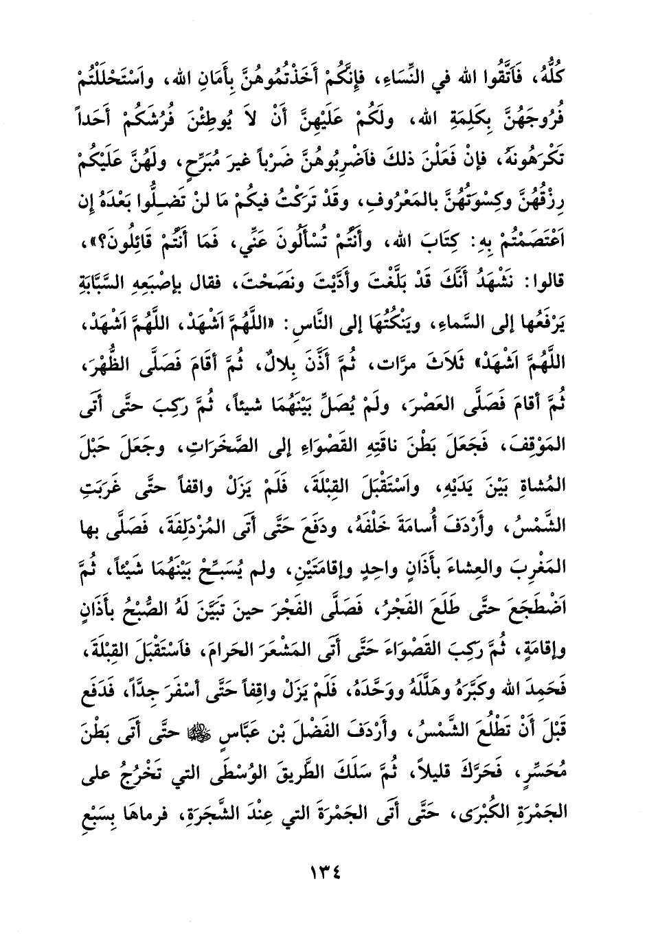 كله, فاتقوا الله في النساء, فإنكم أخذتموهن بأمان الله, واستحللتم فروجهن بكلمة الله, ولكم عليهن أن لا يوطئن فرشكم أحدا تكرهونه, فإن فعلن ذلك فاضربهن ضربا غير مبرح, ولهن عليكم رزقهن وكسوتهن بالمعروف, وقد تركت فيكم ما لن تضلوا بعده إن اعتصمتم به: كتاب الله, وأنتم تسألون عني, فما أنتم قائلون؟ " قالوا: نشهد أنك قد بلغت وأدت ونصحت, فقال بإصبعه السبابة يرفعها إلى السماء, وينكتها إلى الناس: " اللهم أشهد, اللهم أشهد, اللهم أشهد " ثلاث مرات, ثم أذن بلال, قم أقام فصلى الظهر ثم أقام فصلى العصر, ولم يصل بينهما شيئا, ثم ركب حتى أتى الموقف, فجعل بطن ناقته القصواء إلى الصخرات, وجعل حبل المشاة بين يديه, واستقبل القبلة, فلم يزل واقفا حتى غربت الشمس, وأردف أسامة خلفه, ودفع حتى أتى المزدلفة, فصلى بها المغرب والعشاء بأذان واحد وإقامتين, ولم يسبح بينهما شيئا, ثم اضطجع حتى طلع الفجر, فصلى الفجر حين تبين له الصبح بأذان وإقامة ثم ركب القصواء حتى أتى المشعر الحرام, فاستقبل القبلة, فحمد الله وكبره وهلله ووحده, فلم يزل واقفا حتى أسفر جدا, فدفع قبل أن تطلع الشمس, وأردف الفضل بن عباس رضي الله عنهما حتى أتى بطن الجمرة الكبرى, حتى أتى الجمرة التي عند الشجرة, فرماها بسبع