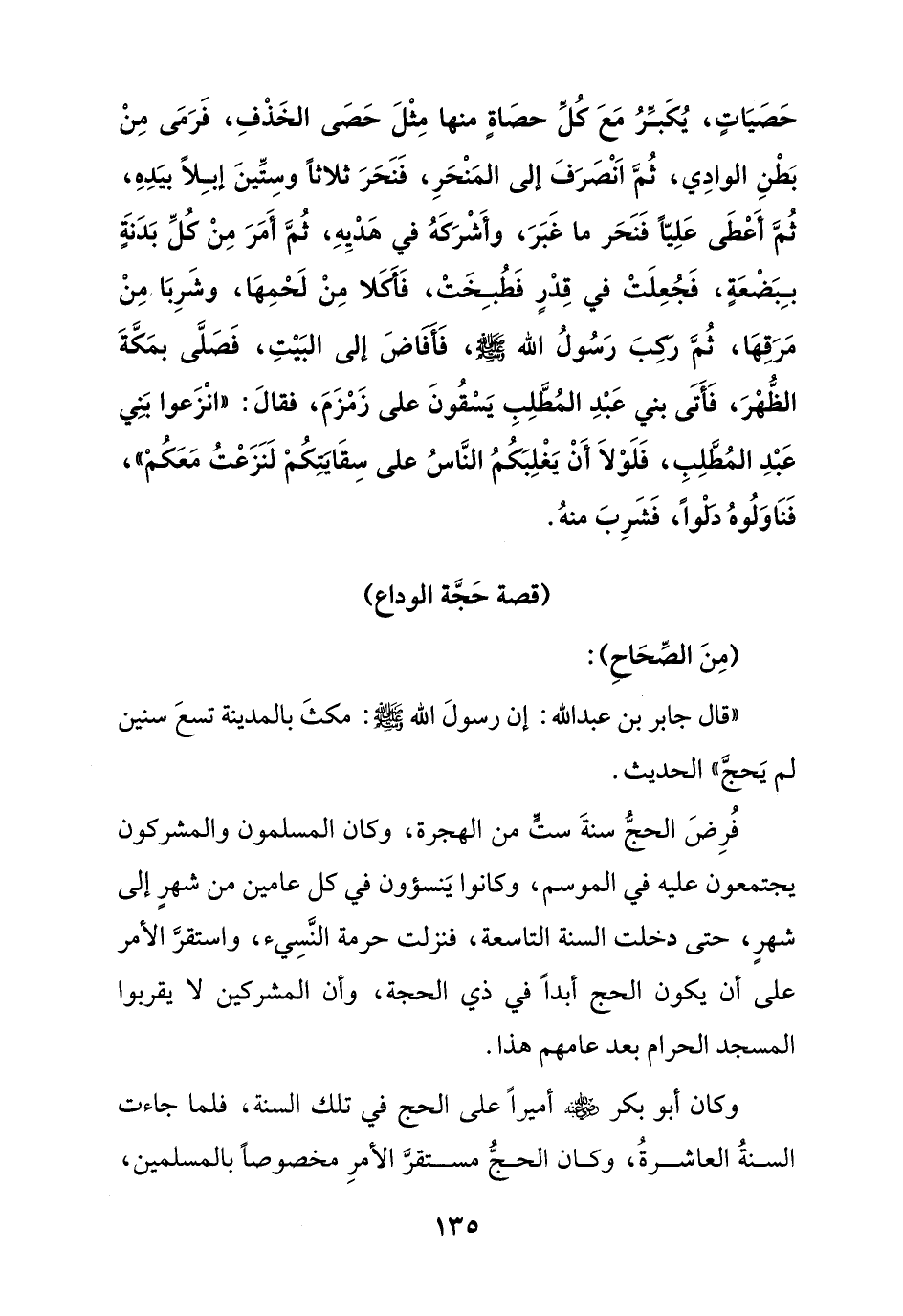 حصيات, يكبر مع كل حصاة منها مثل حصى الخذف, فرمى من بطن الوادي , ثم انصرف إلى المنحر, فنحر ثلاثا وستين إبلا بيده, ثم أعطى عليا فنحر ما غبر, وأشركه في هديه, ثم أمر من كل بدنة ببضعة, فجعلت في قدر فطبخت, فأكلا من لحمها, وشربا من مرقها, ثم ركب رسول الله صلى الله عليه وسلم فأفاض إلى البيت, فصلى بمكة الظهر, فأتى بني عبد المطلب يسقون على زمزم, فقال:: انزعوا بني عبد المطلب, فلولا أن يغلبكم الناس على سقايتكم لنزعت معكم " فناولوه دلوا, فشرب منه.