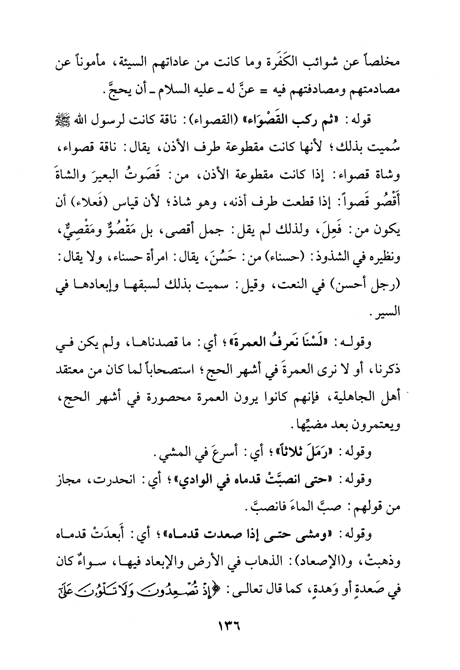 قوله: " ثم ركب القصواء " (القصواء): ناقة كانت لرسول الله صلى الله عليه وسلم سميت بذلك, لأنها كانت مقطوعة طرف الأذن, يقال: ناقة قصواء, وشاة قصواء: إذا كانت مقطوعة الأذن, من: قصوت البعير والشاة أقصو قصوا: إذا قطعت طرف أذنه, وهو شاذ, لأن قياس (فعلاء) أن يكون من: فعل, ولذلك لم يقل: جمل أقصى, بل مقصو ومقصي, ونظيره في الشذوذ: (حسناء) من: حسن, يقال: امرأة حسناء, ولا يقال: (رجل أحسن) في النعت, وقيل: سميت بذلك لسبقها وإبعادها في السير.