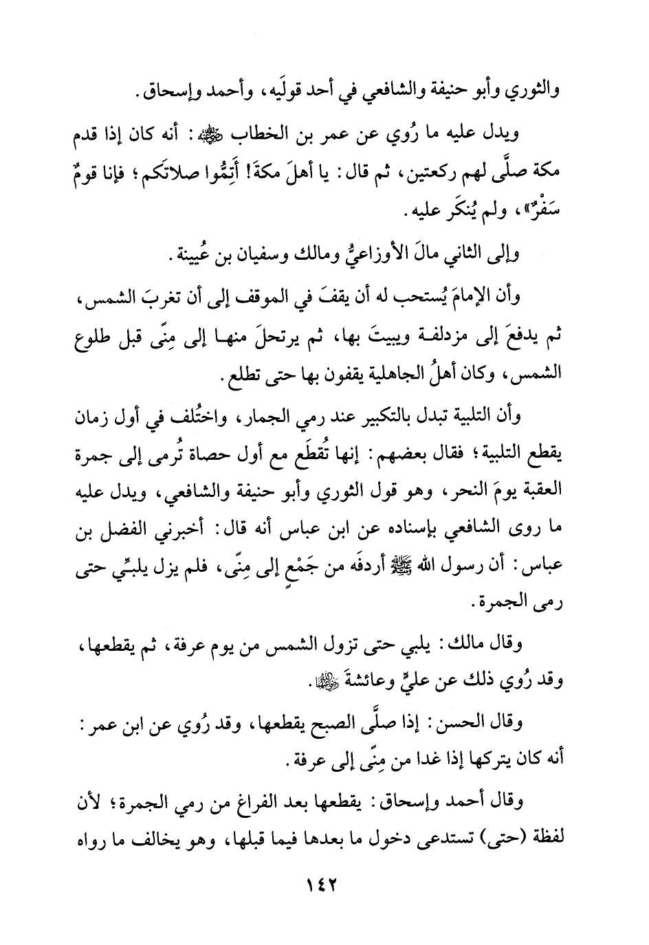 وأن الإمام يستحب له أن يقف في الموقف إلى أن تغرب الشمس, ثم يدفع إلى مزدلفة ويبيت بها, ثم يرتحل منها إلى منى قبل طلوع الشمس, وكان أهل الجاهلية يقفون بها حتى تطلع.