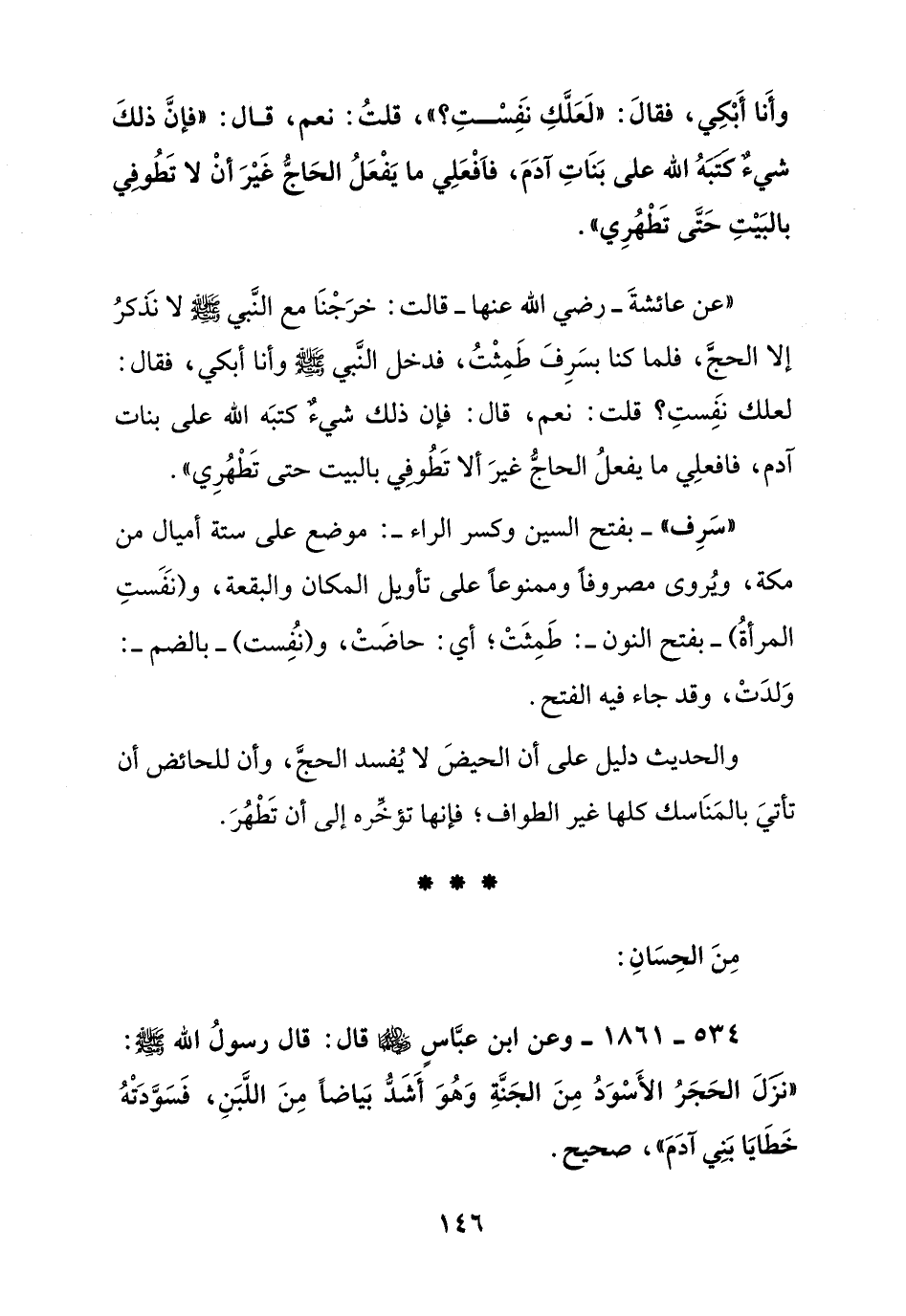 " عن عائشة - رضي الله عنها - قالت: خرجنا مع النبي صلى الله عليه وسلم لا نذكر إلا الحج, فلما كنا بسرف طمثت, فدخل النبي صلى الله عليه وسلم وأنا أبكي, فقال: لعلك نفست؟ قلت: نعم, قال: فإن ذلك شيء كتبه الله على بنات آدم, فافعلي ما يفعل الحاج غير ألا تطوفي بالبيت حتى تطهري ".