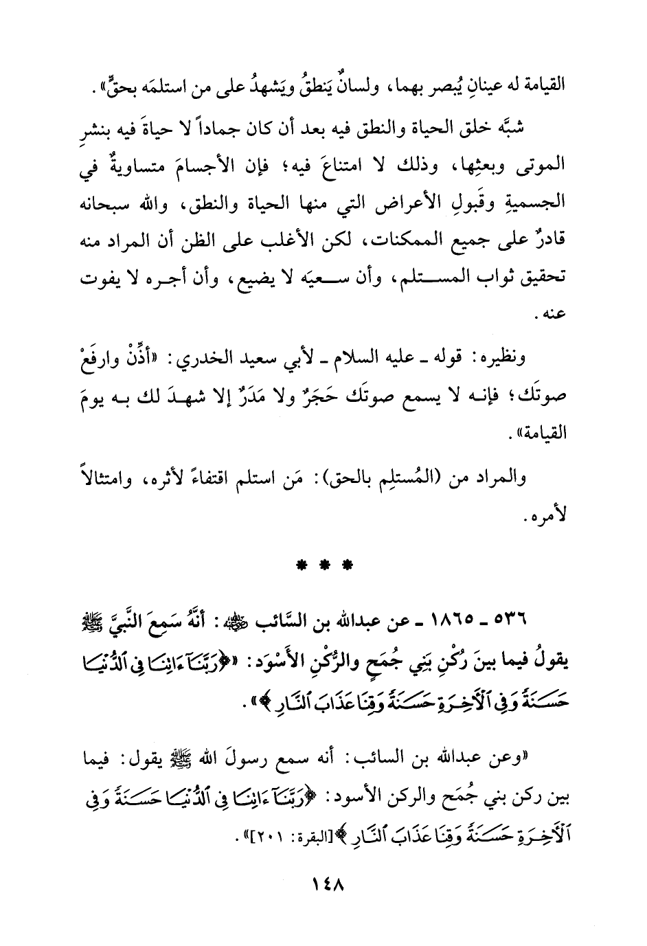 536 - 1865 - عن عبد الله بن السائب رضي الله عنه: أنه سمع النبي صلى الله عليه وسلم يقول فيما بين ركن بني جمح والركن الأسود: {ربنا آتنا في الدنيا حسنة وفي الآخرة حسنة وقنا عذاب النار {.