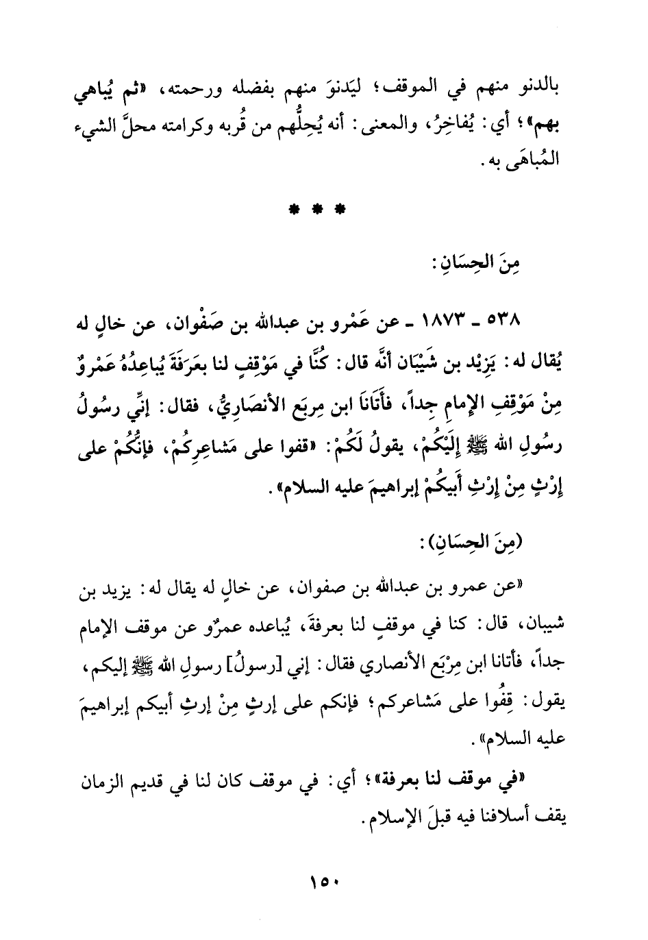 538 - 1873 - عن عمرو بن عبد الله بن صفوان, عن خال له يقال له: يزيد بن شيبان أنه قال: كنا في موقف لنا بعرفة يباعده عمرو من موقف الإمام جدا, فأتانا ابن مربع الأنصاري, فقال: إني رسول رسول الله صلى الله عليه وسلم إليكم, يقول لكم: " قفوا على مشاعركم, فإنكم على إرث من إرث أبيكم إبراهيم عليه السلام ".