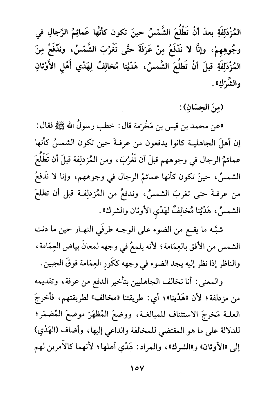 " عن محمد بن قيس بن مخرمة قال: خطب رسول الله صلى الله عليه وسلم فقال: إن أهل الجاهلية كانوا يدفعون من عرفة حين تكون الشمس كأنها عمائم الرجال في وجوههم قبل أن تغرب, ومن المزدلفة قبل أن تطلع الشمس, حين تكون كأنها عمائم الرجال في وجوههم, وإنا لا ندفع من عرفة حتى تغرب الشمس, وندفع من المزدلفة قبل أن تطلع الشمس, هدينا مخالف لهدي الأوثان والشرك ".