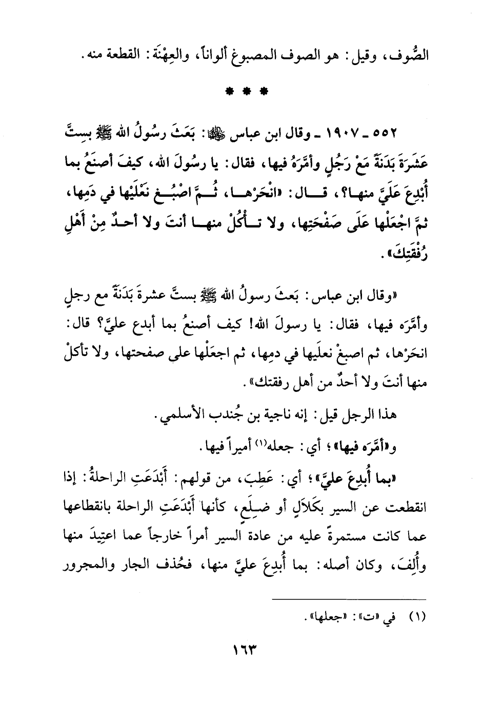 552 - 1907 - وقال ابن عباس رضي الله عنهما: بعث رسول الله صلى الله عليه وسلم بست عشرة بدنة مع رجل وأمره فيها, فقال: يا رسول الله كيف أصنع بما أبدع علي منها؟ قال: " انحرها, ثم اصبغ نعليها في دمها, ثم اجعلها على صفحتها , ولا تأكل منها أنت ولا أحد من أهل رفقتك ".