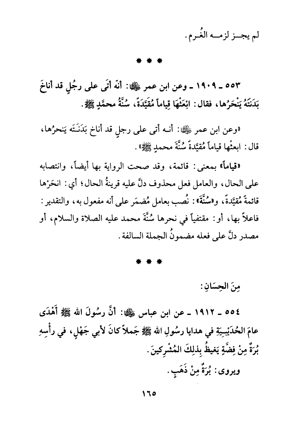 553 - 1909 - وعن ابن عمر رضي الله عنهما: أنه أتى على رجل قد أناخ بدنته ينحرها, فقال: ابعثها قياما مقيدة, سنة محمد صلى الله عليه وسلم.