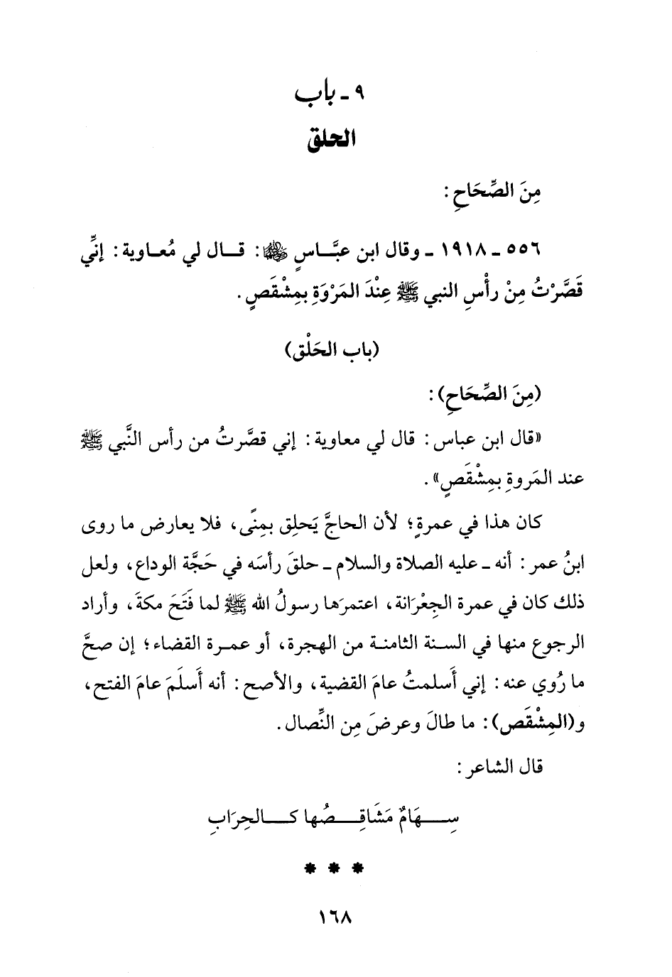 556 - 1918 - وقال ابن عباس رضي الله عنهما: قال لي معاوية: إني قصرت من رأس النبي صلى الله عليه وسلم عند المروة بمشقص.