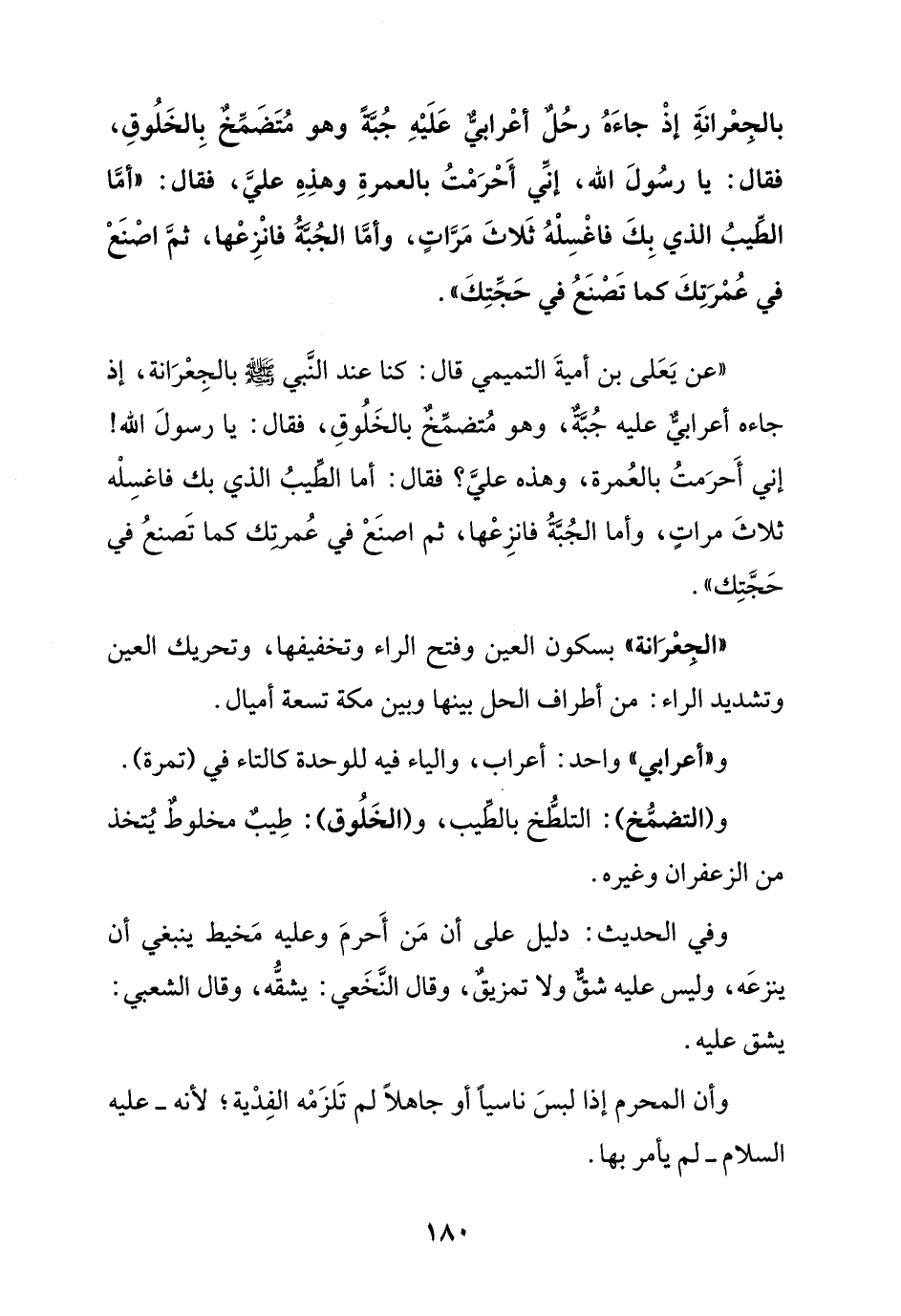بالجعرانة إذ جاءه رحل أعرابي عليه جبة وهو متضمخ بالخلوق فقال: يا رسول الله, إني أحرمت بالعمرة وهذه علي, فقال: " أما الطيب الذي بك فاغسله ثلاث مرات, وأما الجبة فانزعها, ثم اصنع في عمرتك كما تصنع ف حجتك ".