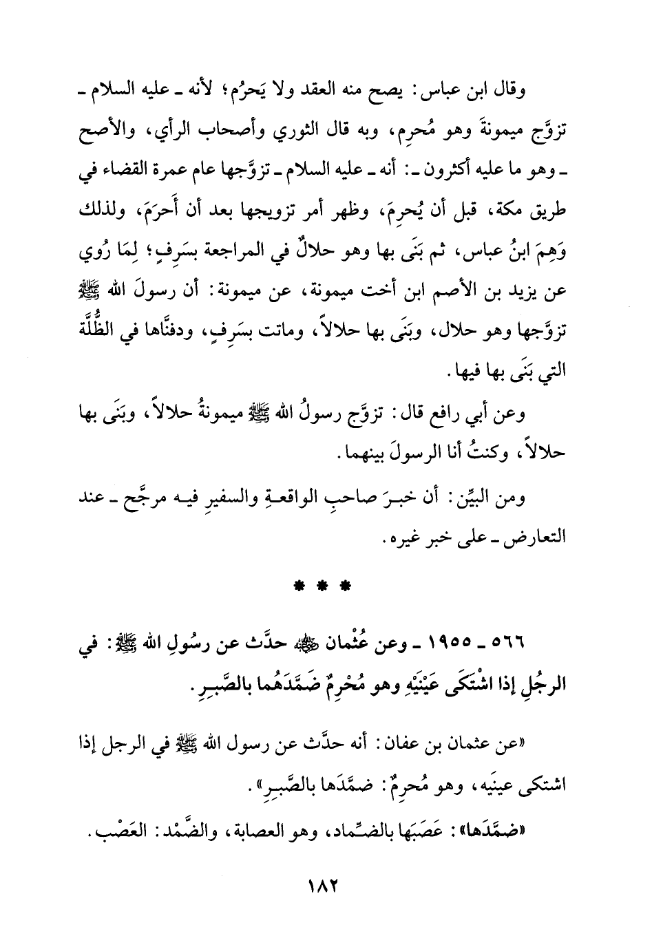 566 - 1955 - وعن عثمان رضي الله عنه حدث عن رسول الله صلى الله عليه وسلم: في الرجل إذا اشتكى عينيه وهو محرم ضمدهما بالصبر.