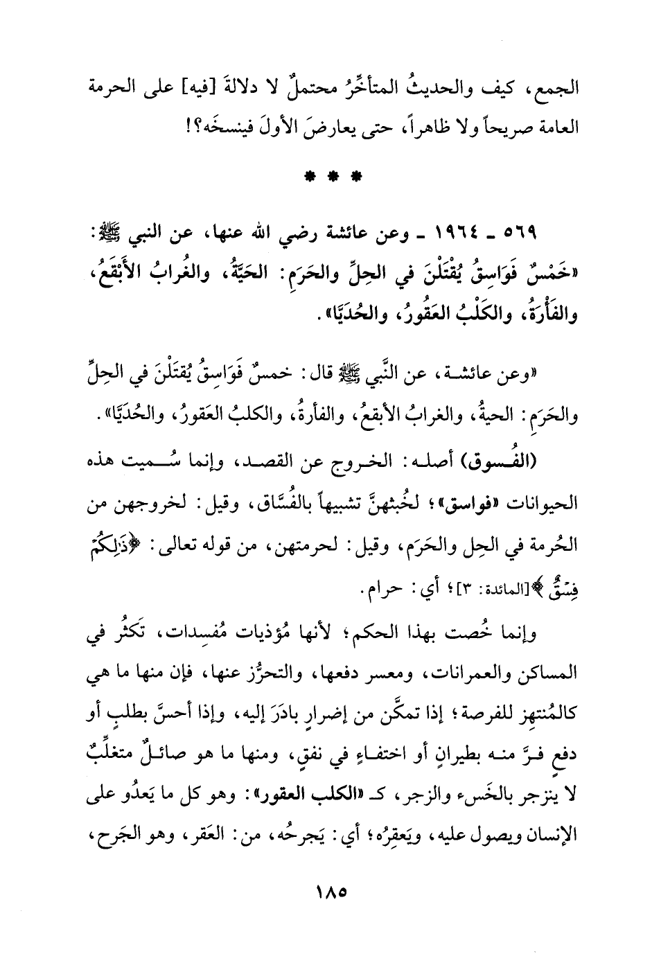 569 - 1964 - وعن عائشة رضي الله عنها, عن النبي صلى الله عليه وسلم:" خمس فواسق يقتلن في الحل والحرم: الحية, والغراب الأبقع, والفأرة, والكلب العقور, والحديا ".