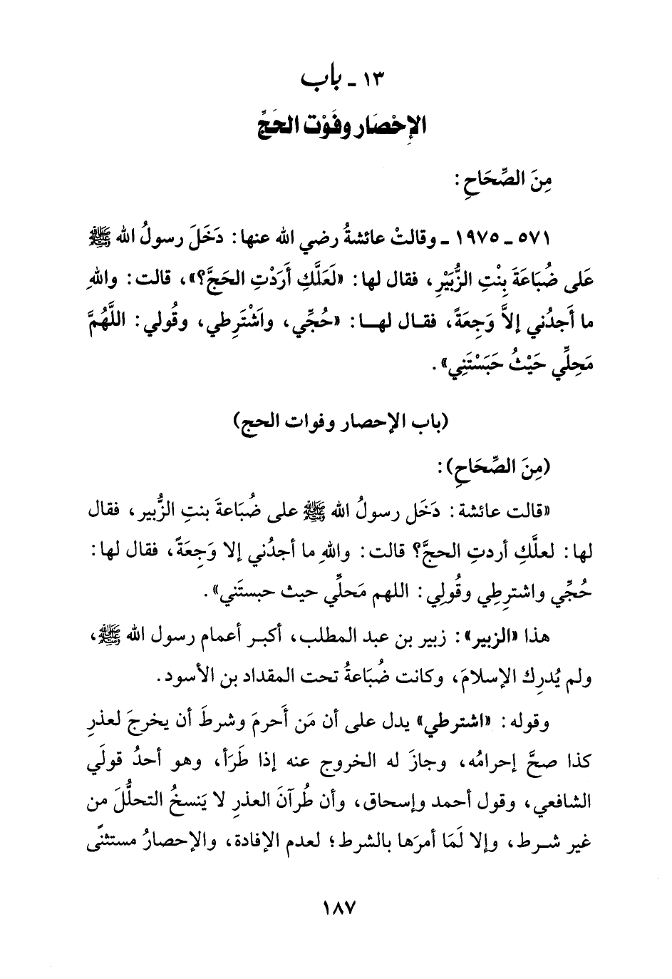 571 - 1975 - وقالت عائشة رضي الله عنها: دخل رسول الله صلى الله عليه وسلم على ضباعة بنت الزبير, فقال لها: " لعلك أردت الحج؟ " قالت: والله ما أجدني إلا وجعة, فقال لها: " حجي, واشترطي, وقولي: اللهم محلي حيث حبستني ".