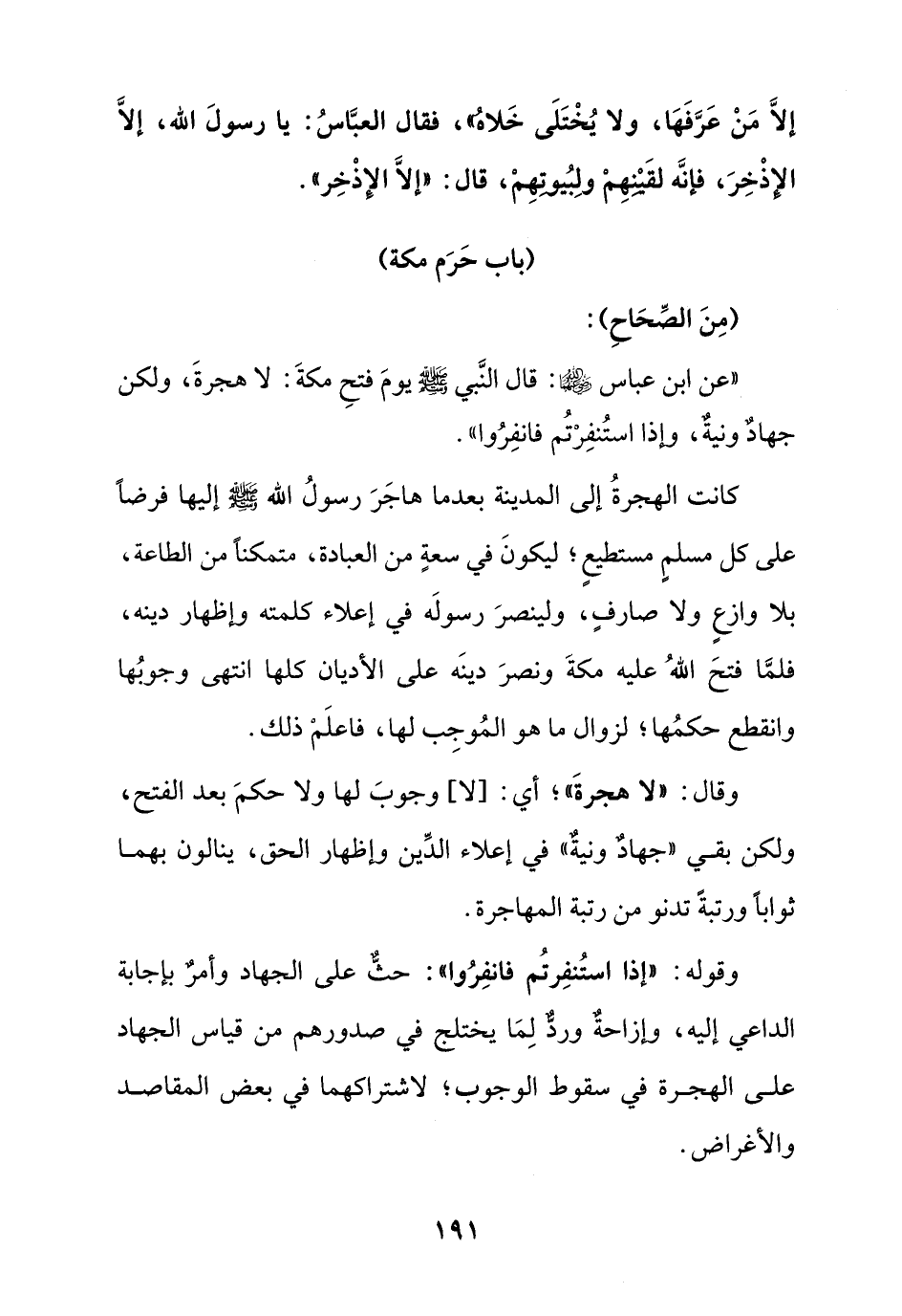 " عن ابن عباس رضي الله عنهما: قال النبي صلى الله عليه وسلم يوم فتح مكة: لا هجرة, ولكن جهاد ونية, وإذا استنفرتم فانفروا ".