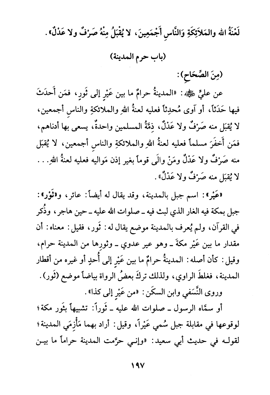 عن علي رضي الله عنه:" المدينة حرام ما بين عير إلى ثور, فمن أحدث فيها حدثا, أو آوى محدثا فعليه لعنة الله والملائكة والناس أجمعين, لا يقبل منه صرف ولا عدل ذمة المسلمين واحدة, يسعى بها أدناهم, فمن أخفر مسلما فعليه لعنة الله والملائكة والناس أجمعين, لا يقبل منه صرف ولا عدل ومن والى قوما بغير إذن مواليه فعليه لعنة الله ... لا يقبل منه صرف ولا عدل ".