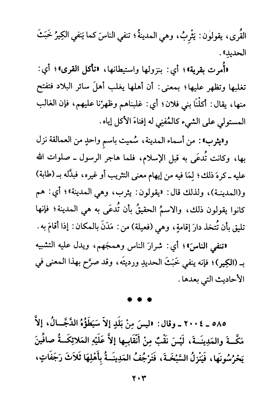 585 - 2004 - وقال: " ليس من بلد إلا سيطؤه الدجال, إلا مكة والمدينة, ليس نقب من أنقابها إلا عليه الملائكة صافين يحرسونها, فينزل السبخة, فترجف المدينة بأهلها ثلاث رجفات,