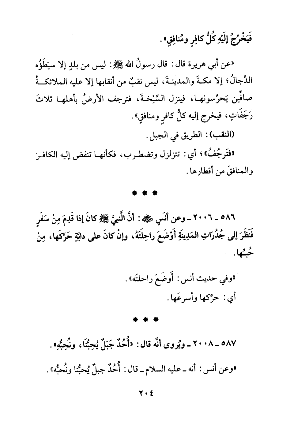 586 - 2006 - وعن أنس رضي الله عنه: أن النبي صلى الله عليه وسلم كان إذا قدم من سفر فنظر إلى جدرات المدينة أوضع راحلته, وإن كان على دابة حركها, من حبها.