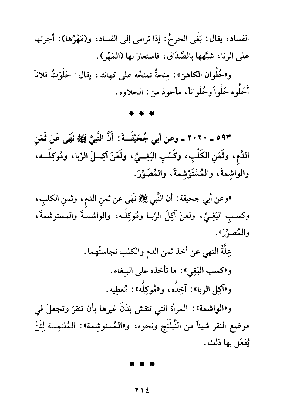 593 – 2020 – وعن أبي جحيفة: أن النبي صلى الله عليه وسلم نهى عن ثمن الدم, وثمن الكلب, وكسب البغي, ولعن آكل الربا, وموكله, والواشمة, والمستوشمة, والمصور.
