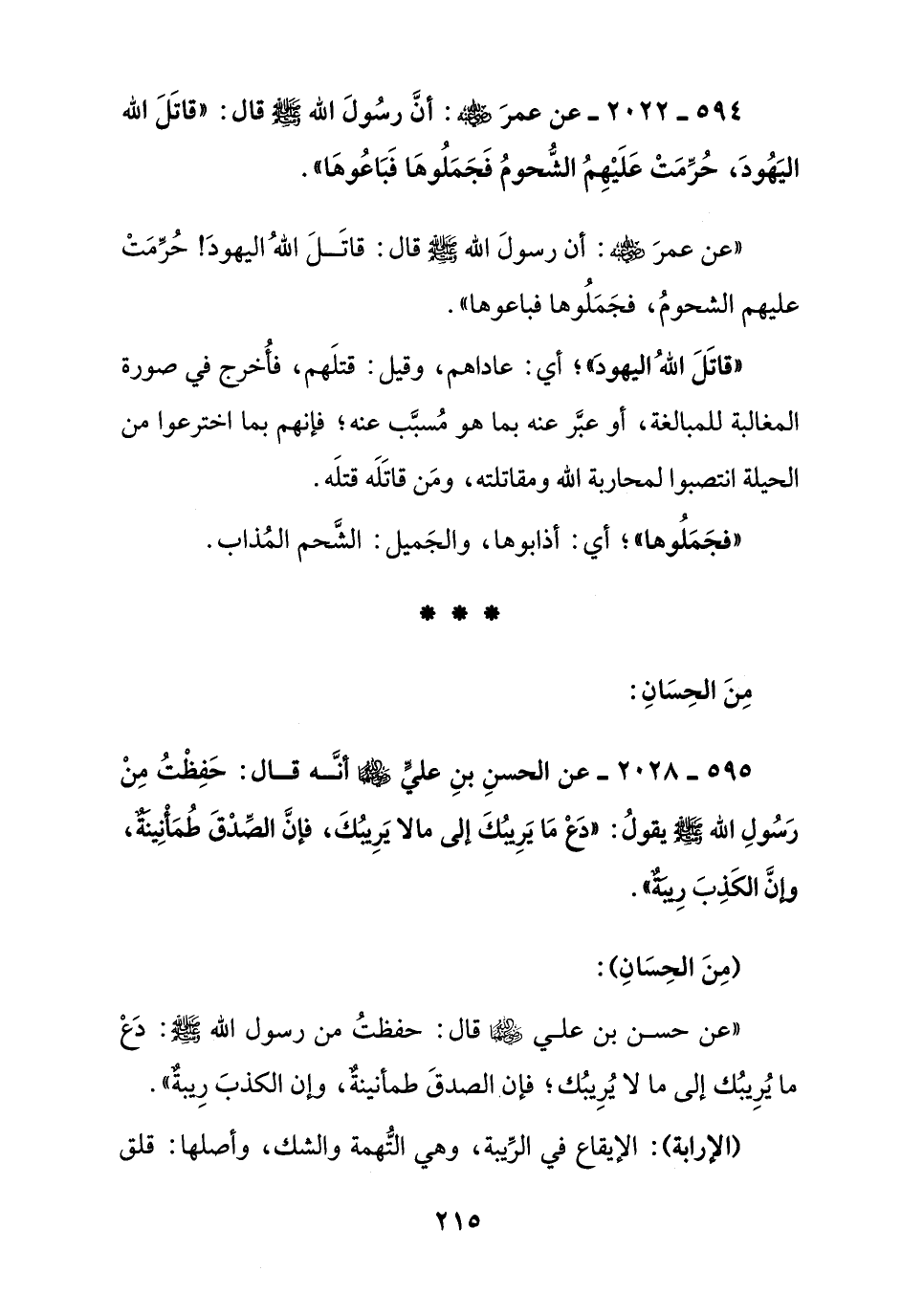 594 – 2022 – عن عمر رضي الله عنه: أن رسول الله صلى الله عليه وسلم قال: " قاتل الله اليهود, حرمت عليهم الشحوم فجملوها فباعوها ".