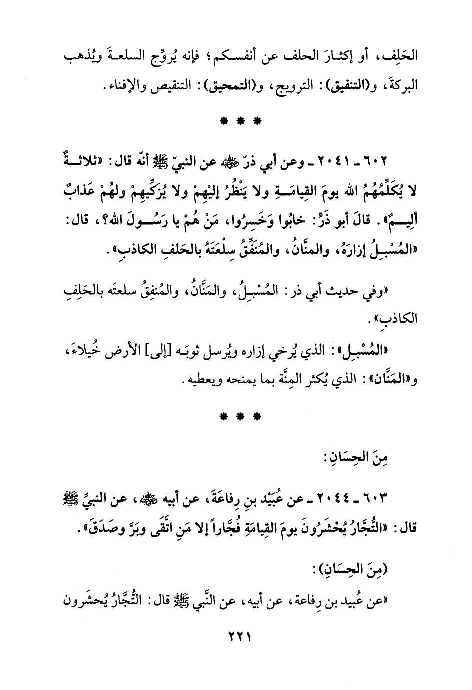 602 - 2041 - وعن أبي ذر صلى الله عليه وسلم عن النبي صلى الله عليه وسلم أنه قال: " ثلاثة لا يكلمهم الله يوم القيامة ولا ينظر إليهم ولا يزكيهم ولهم عذاب أليم " قال أبو ذر: خابوا وخسروا, من هم يا رسول الله؟ قال: " المسبل إزاره, والمنان, والمنفق سلعته بالحلف الكاذب ".