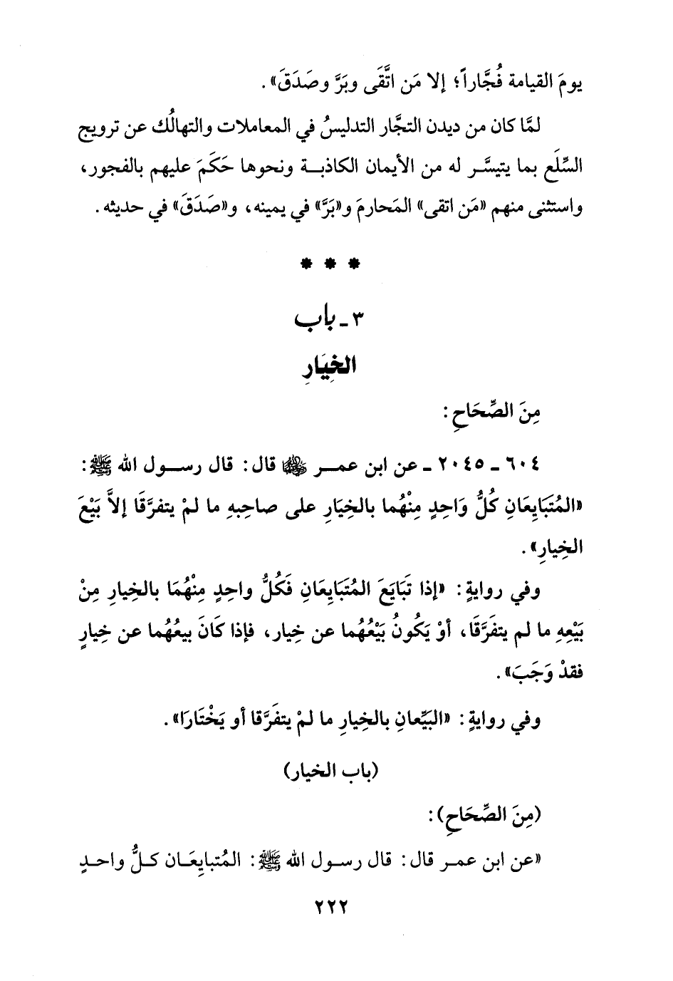 604 - 2045 - عن ابن عمر رضي الله عنهما قال: قال رسول الله صلى الله عليه وسلم: " المتبايعان كل واحد منهما بالخيار على صاحبه ما لم يتفرقا إلا بيع الخيار ".