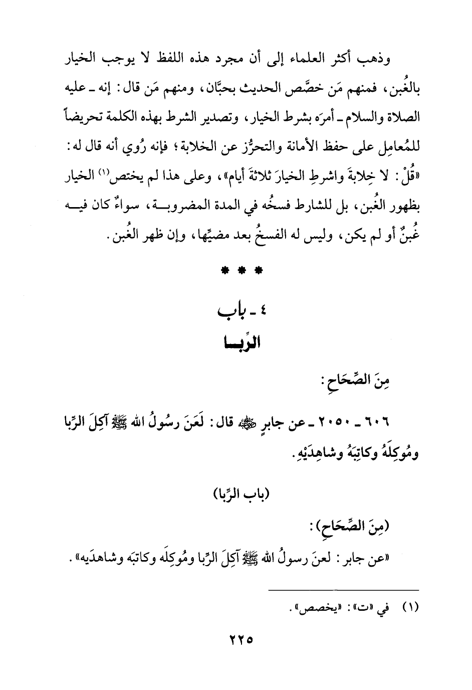 606 - 2050 - عن جابر رضي الله عنه قال: لعن رسول الله صلى الله عليه وسلم آكل الربا وموكله وكاتبه وشاهديه.