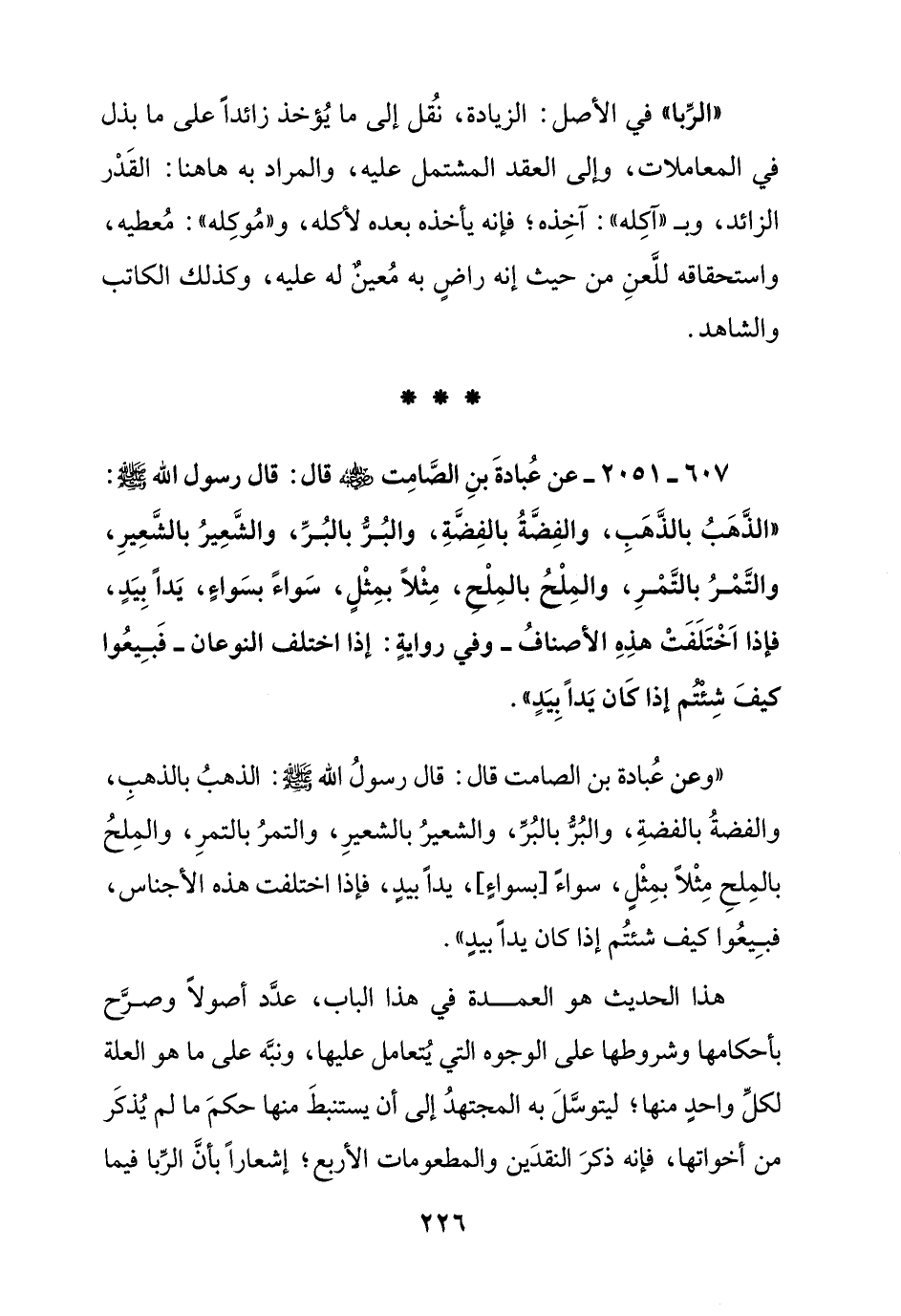 607 - 2051 - عن عبادة بن الصامت رضي الله عنه قال: قال رسول الله صلى الله عليه وسلم:" الذهب بالذهب, والفضة بالفضة, والبر بالبر, والشعير بالشعير, والتمر بالتمر, والملح بالملح, مثلا بمثل, سواء بسواء, يدا بيد, فإذا اختلفت هذه الأوصاف - وفي رواية: إذا اختلف النوعان - فبيعوا كيف شئتم إذا كان يدا بيد ".