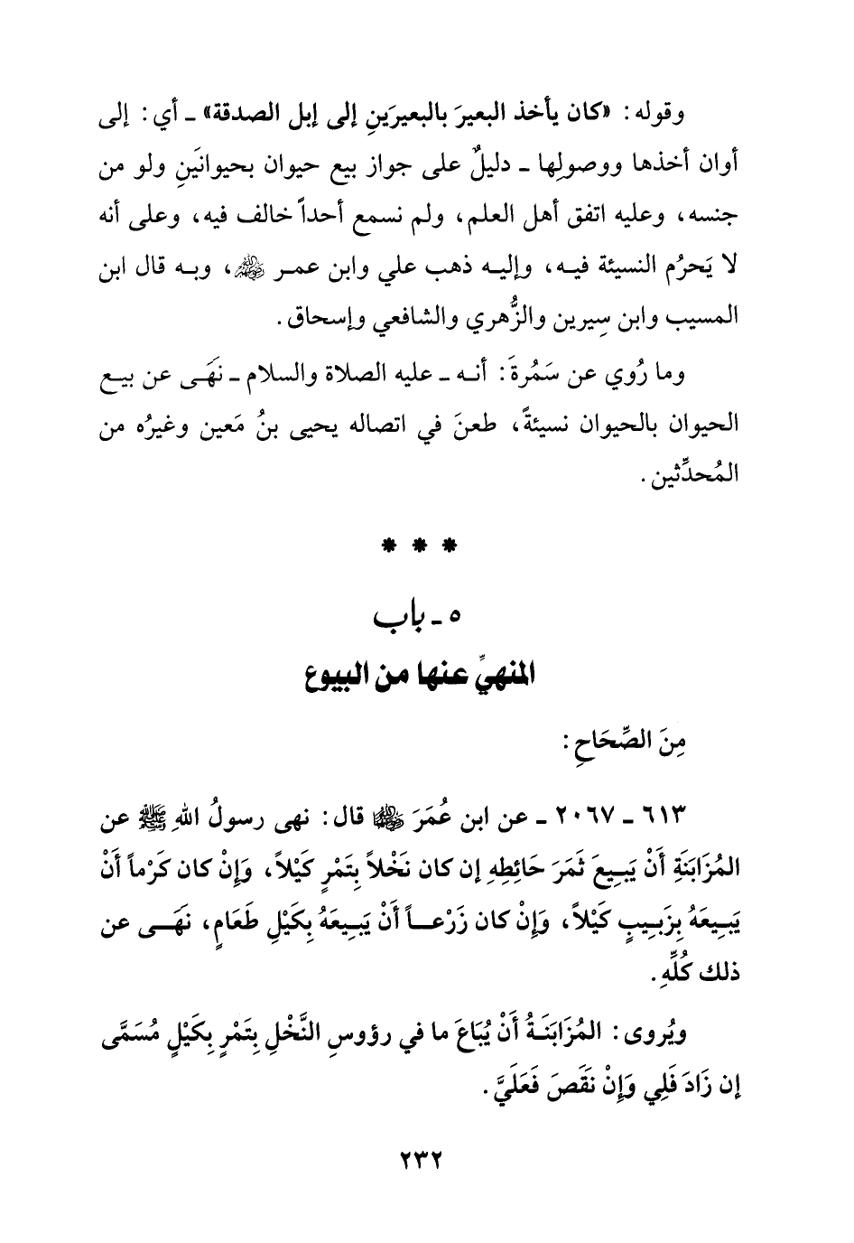 613 - 2067 - عن ابن عمر رضي الله عنهما قال: نهى رسول الله صلى الله عليه وسلم عن المزابنة أن يبيع ثمر حائطه إن كان نخلا بتمر كيلا, وإن كان كرما أن يبيعه بزبيب كيلا, وإن كان زرعا أن يبيعه بكيل طعام, نهى عن ذلك كله.