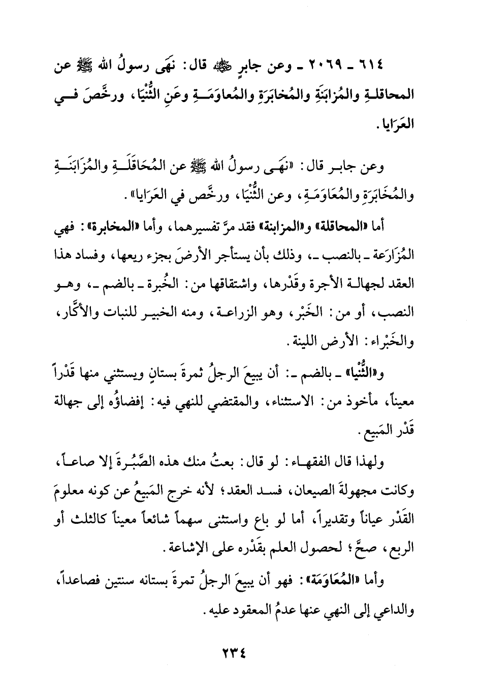 614 - 2069 – وعن جابر رضي الله عنه قال: نهى رسول الله صلى الله عليه وسلم عن المحاقلة والمزابنة والمخابرة والمعاومة وعن الثنيا, ورخص في العرايا.