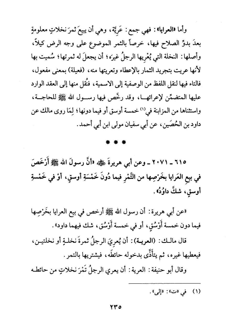 615 – 2071 – وعن أبي هريرة رضي الله عنه:" أن رسول الله صلى الله عليه وسلم أرخص في بيع العرايا بخرصها من التمر فيما دون خمسة أوسق, أو في خمسة أوسق, شك داود ".