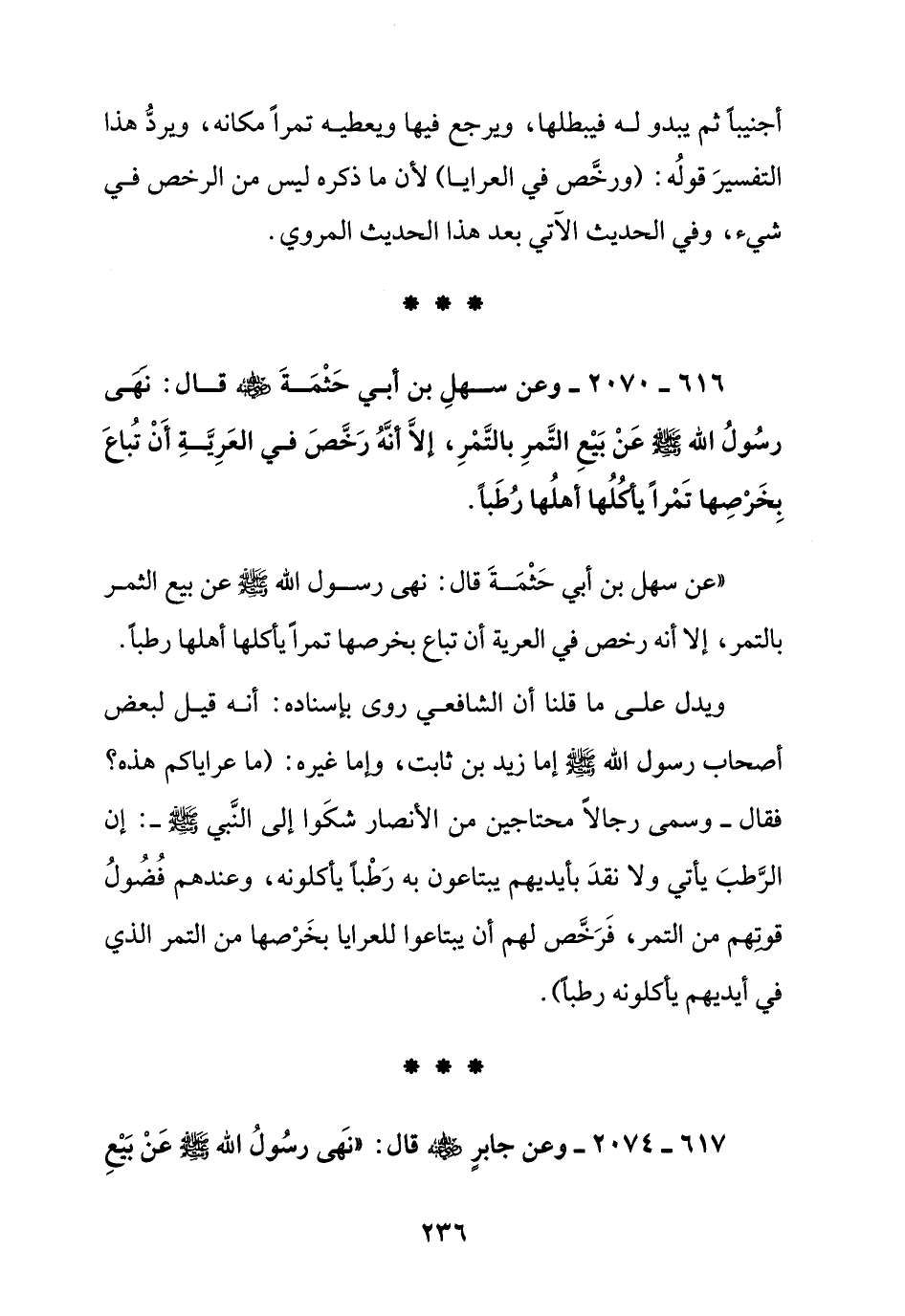 616 – 2070 – وعن سهل بن أبي حثمة رضي الله عنه قال: نهى رسول الله صلى الله عليه وسلم عن بيع التمر بالتمر, إلا أنه رخص في العرية أن تباع بخرصها تمرا يأكلها أهلها رطبا ".