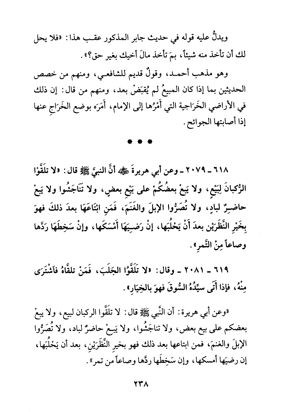 618 – 2079 – وعن أبي هريرة رضي الله عنه أن النبي صلى الله عليه وسلم قال: " لا تلقوا الركبان لبيع, ولا يبع بعضكم على بيع بعض, ولا تناجشوا ولا يبع حاضر لباد, ولا تصروا الإبل والغنم, فمن ابتاعها بعد ذلك فهو بخير النظرين بعد أن يحلبها, إن رضيها أمسكها, وإن سخطها ردها وصاعا من التمر "
