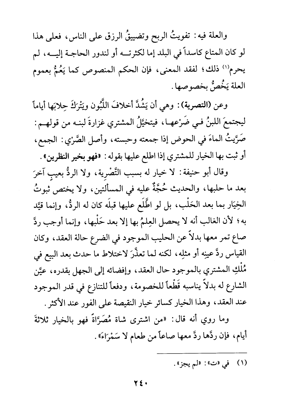 وقال أبو حنيفة: لا خيار له بسبب التصرية, ولا الرد بعيب آخر بعد ما حلبها, والحديث حجة عليه في المسألتين, ولا يختص ثبوت الخيار بما بعد الحلب, بل لو اطلع عليها قبله كان له الرد, وإنما قيد به, لأن الغالب أنه لا يحصل العلم بها إلا بعد حلبها, وإنما أوجب رد صاع تمر معها بدلا عن الحليب الموجود في الضرع حالة العقد, وكان القياس رد عينه أو مثله, لكنه لم تعذر لاختلاط ما حدث بعد البيع في ملك المشتري بالموجود حال العقد وإفضائه إلى الجهل بقدره, هين الشارع له بدلا يناسبه قطعا للخصومة, ودفعا للتنازع في قدر الموجود عند العقد, وهذا الخيار كسائر خيار النقيصة على الفور عند الأكثر.