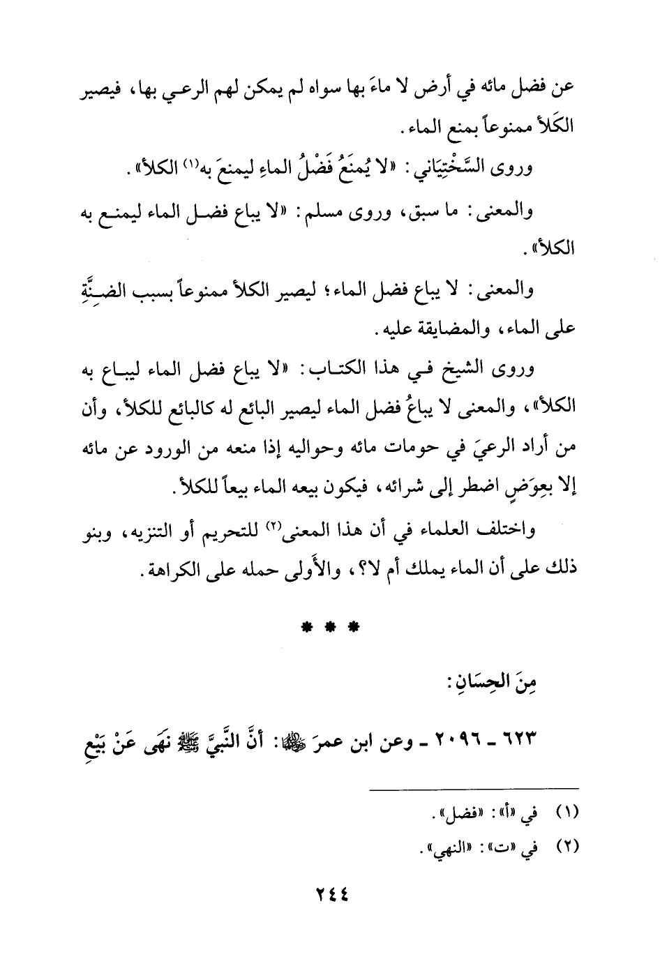 وروى الشيخ في هذا الكتاب: " لا يباع فضل الماء ليباع به الكلأ " والمعنى لا يباع فضل الماء ليصير البائع له كالبائع للكلأ, وإن من أراد الرعي في حمات مائه وحواليه إذا منعه من الورود عن مائه إلا بعوض اضطر إلى شرائه, فيكون بيعه الماء بيعا للكلأ.